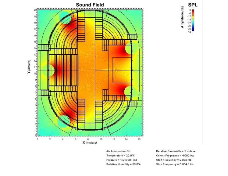 As the image below shows, the field coverage map, rendered through Meyersound Mapp software, mainly covered the area where visitors may have taken seat.